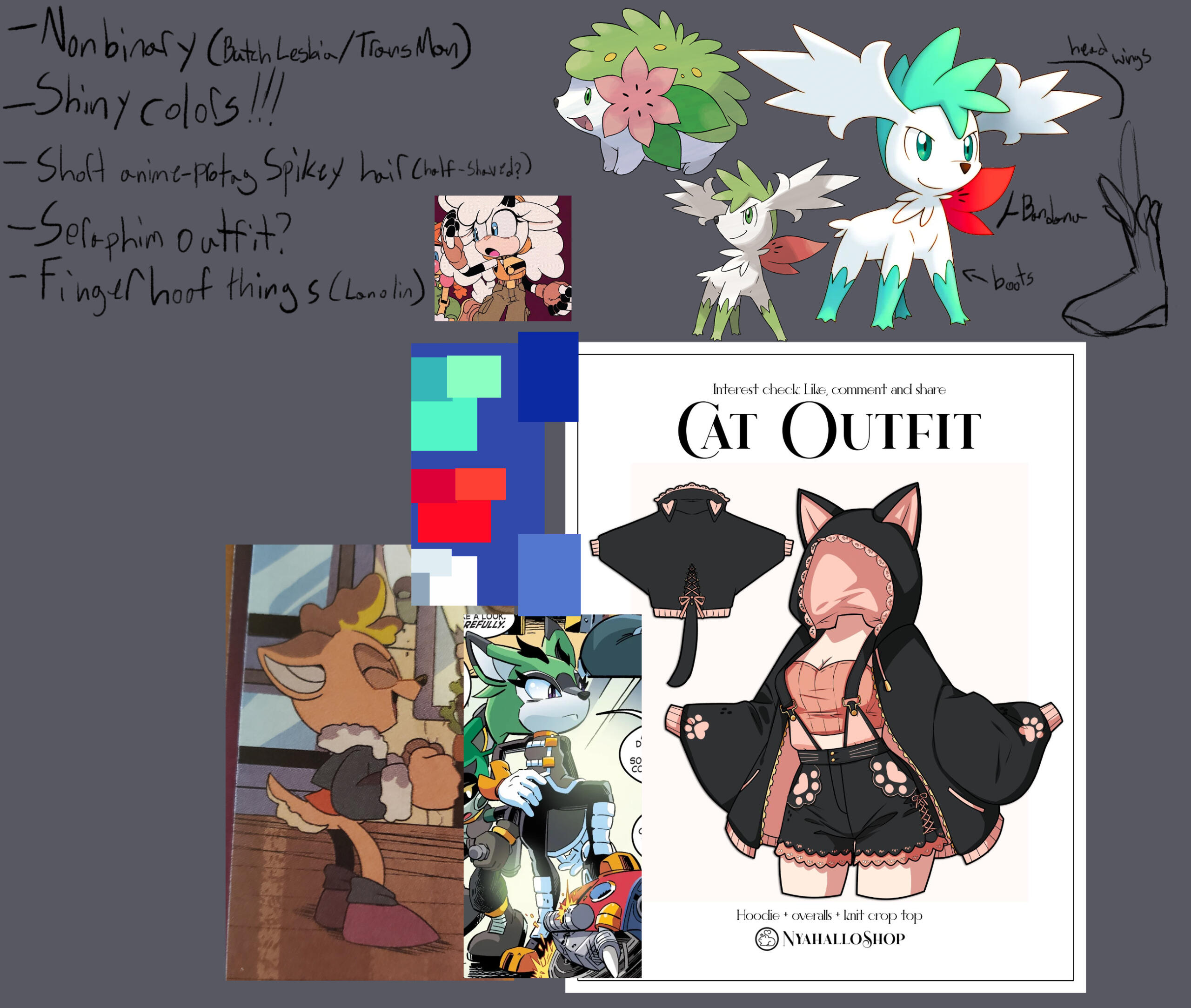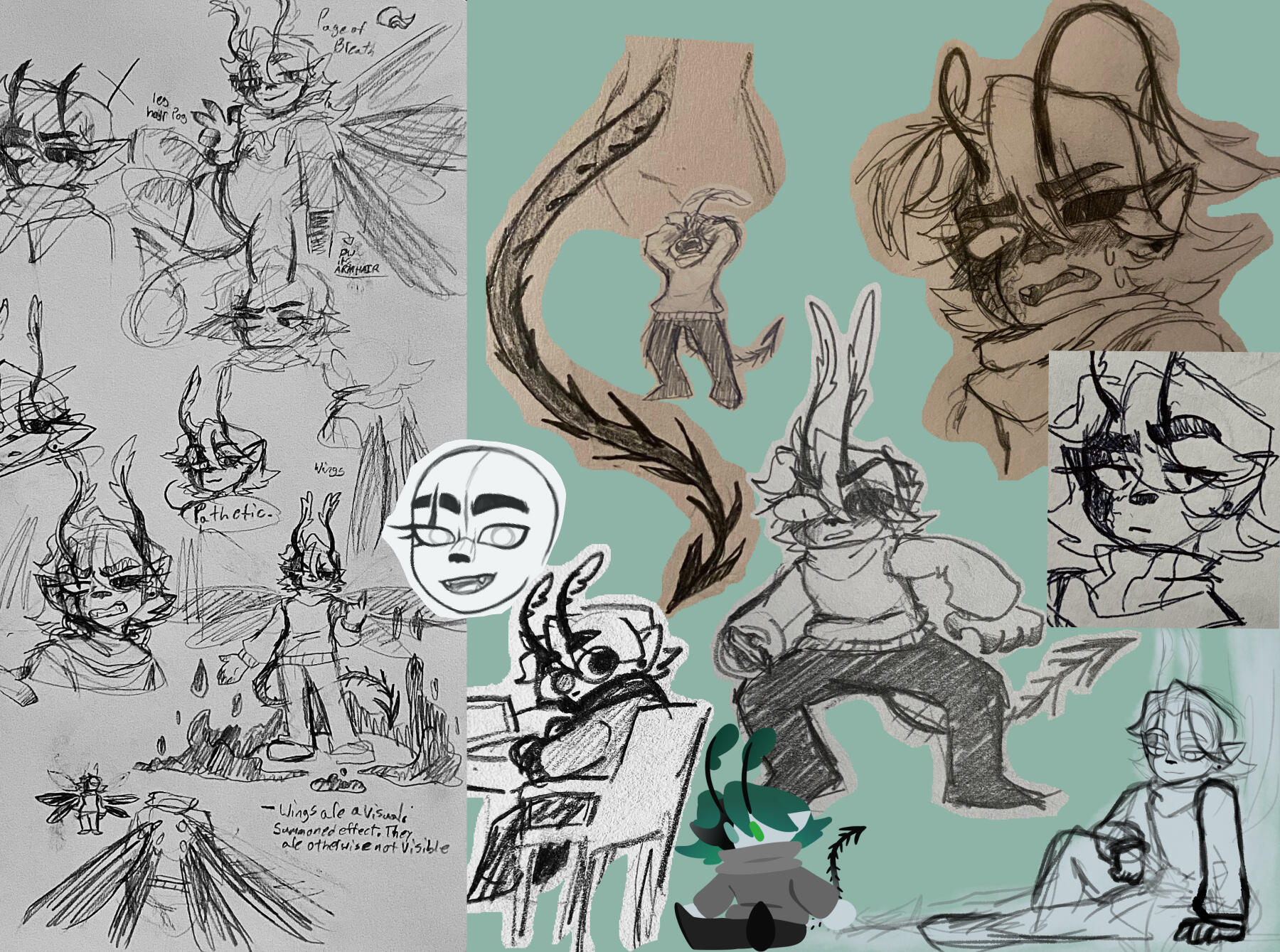 We will work together on a collage of images that correspond with what kind of character you want. As you can see, this can range from more notes than images, to more images than notes, to even more references than needed.