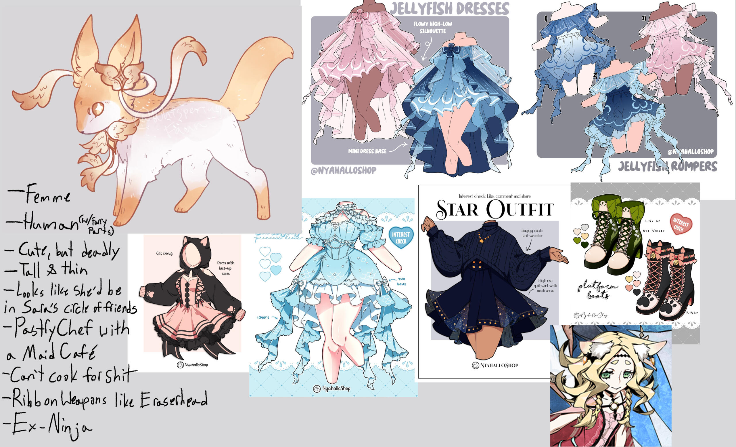 Custom OCs drawn and designed by me, with as much input as you want/need to convey.Alternate forms, so long as they are not too different from the base, will count as an extra outfit. Anything more complex may cost extra.For character redesigns, just hand me the references of the original design, then let me know what you want to keep and what needs changing! This is marked as a discount due to most of the design process already being done.Outfit/Form refers to me keeping the base design, but only changing the outfit OR designing them an alternate form. Any alt. form designs too different from the base will instead count as a Redesign.
